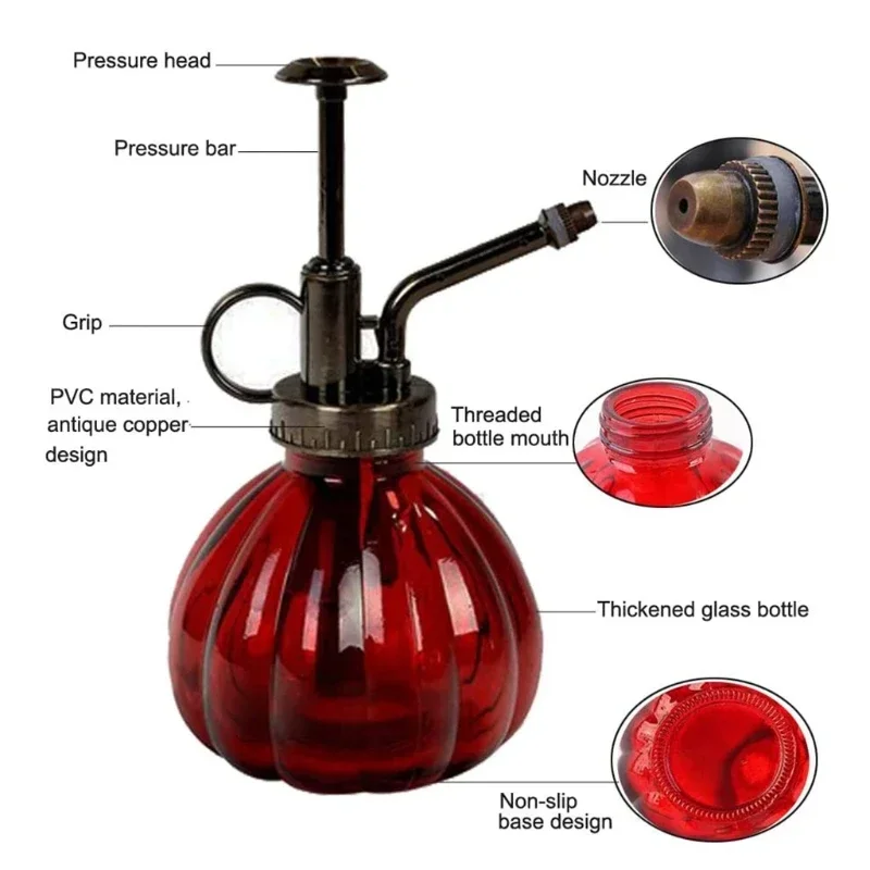 This vintage glass watering can is designed for both functionality and aesthetic appeal. With a charming pumpkin shape and an imitation bronze nozzle, it serves as a delightful addition to your home or office decor. Perfect for misting plants or as a unique gift, this sprayer combines practicality with a nostalgic touch.