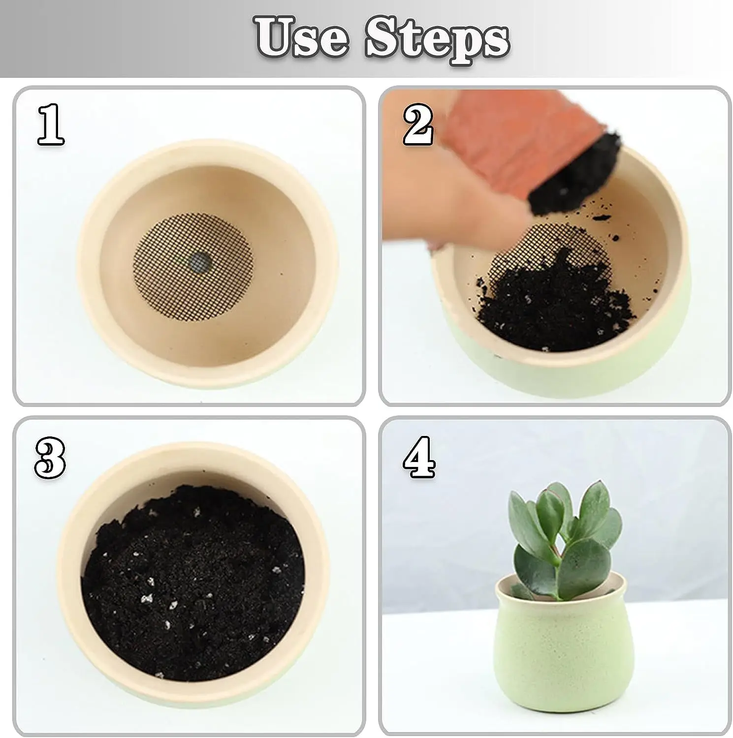 • Function: Prevents soil from running out through drainage holes in pots.
