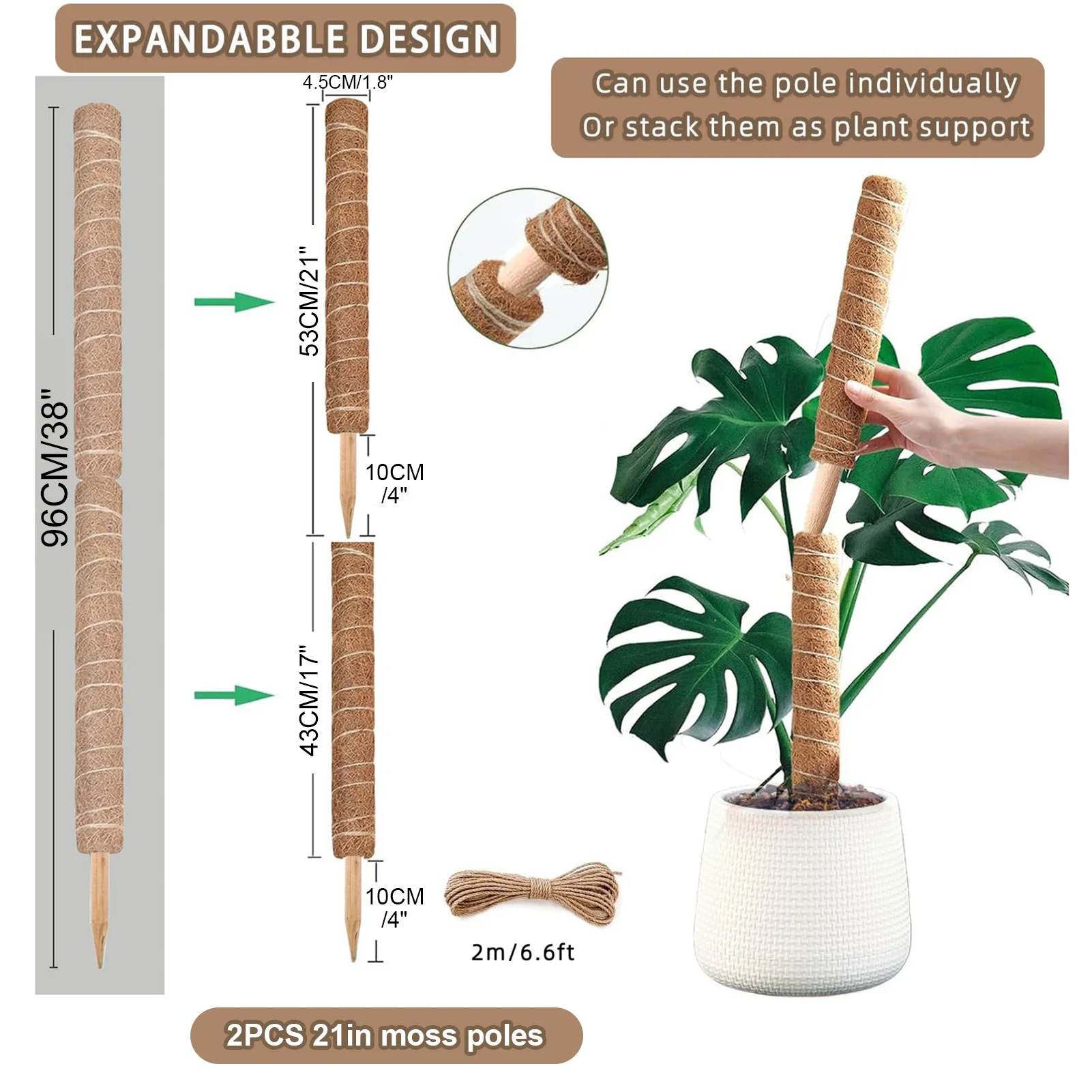This stackable moss pole set is designed to support climbing plants such as Monstera and pothos. Available in three sizes: approximately 38CM, 43CM, and 53CM, these coir poles provide a natural and effective way for your plants to grow upwards.
