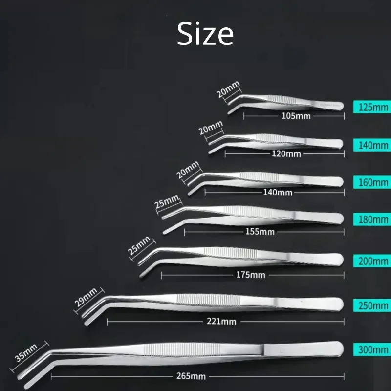 The Stainless Multifunctional Steel Elbow Tweezers are designed for various applications including aquarium maintenance, medical use, and pet feeding. These long tongs feature a non-slip grip for enhanced control and precision.